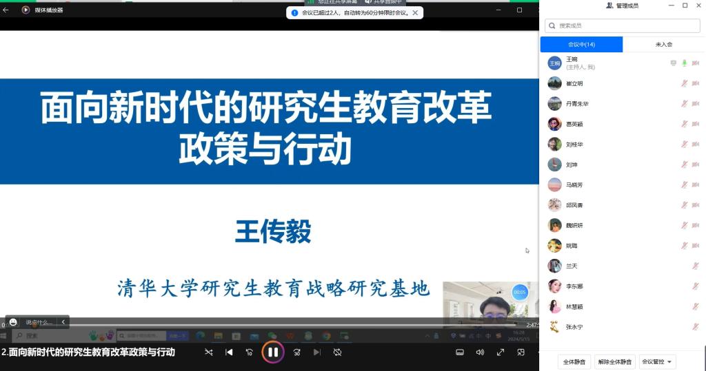 院长葛英颖主持会议,并介绍了我院要高度重视教育科学研究在教育发展和改革中的重要作用。清华大学副教授王传毅分享专题报告《面向新时代的中国研究生教育改革:近三年研究生教育重大改革政策解读》,解读分析全国研究生教育会议的战略意义,梳理一系列政策文件的逻辑体系。明确了新一轮研究生教育改革的总体目标和根本任务,并分别聚焦全面质量管理、导师队伍建设和专业学位研究生教育,对研究生教育改革作出系统部署。