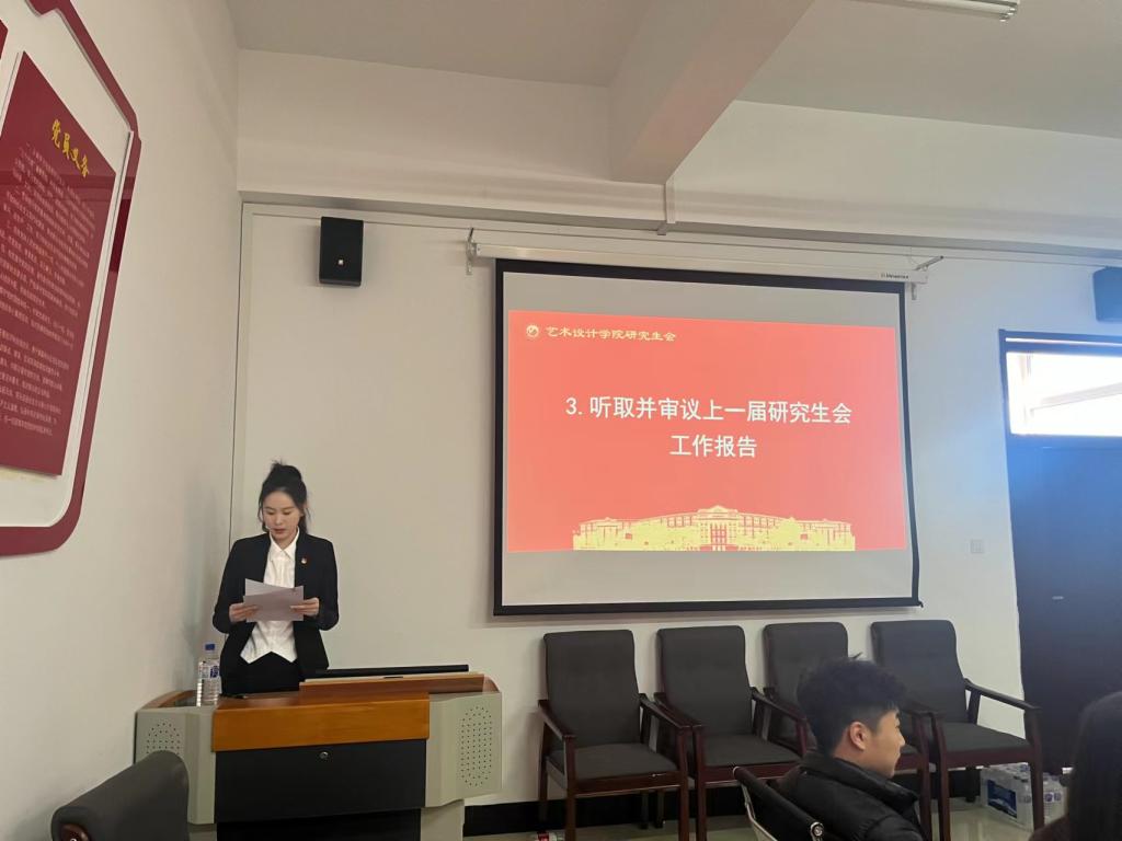 正式会议开始,由学院第三届研究生会轮值主席王乃玉做工作报告。她从研究生会的组织协调、思想引领、服务同学、文化育人等方面回顾总结了上一届研究生会的工作,为校园文化的发展和建设贡献自己的青春和力量。