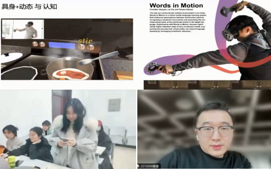 夏磊博士讲座的主题是“嗅觉计算:嗅觉界面设计如何让数字具身更像我们的队友”,介绍了嗅觉界面设计的历史,以清华大学未来实验室为案例,分析了我国在嗅觉界面设计研究动态;讲解了具身+动态与认知,以案例形式,分析了在VR语言学习环境中,运动手势和记忆是如何发挥作用的;以及嗅觉界面设计如何让数字具身更像我们的队友。在互动环节,夏磊博士认真地解答了同学们的问题,并鼓励同学们去了解人工智能并真正会使用它。