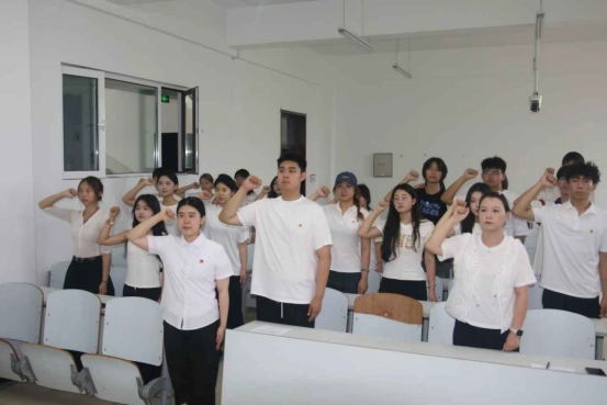 随后,侯天放郑重为实践团队授旗,鲜红的旗帜承载着使命与荣光。紧接着,志愿者代表刘芹逸带领全体队员庄严宣誓,承诺“以艺赋能,服务基层”。院学生团委副书记李帅兵作为代表坚定表态,将带领团队用设计力量美化乡村、助力治理,让艺术在实践中闪光,让成果在田野中生辉。