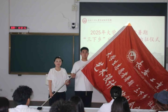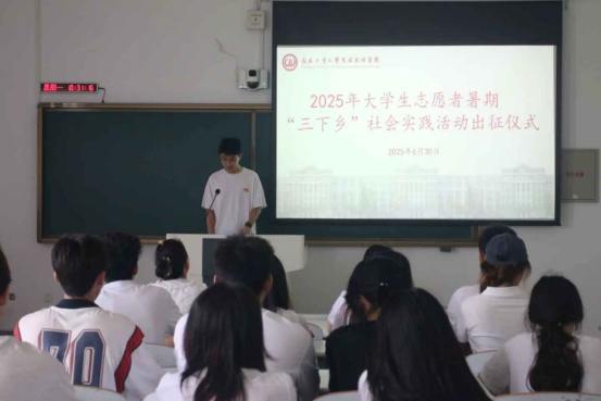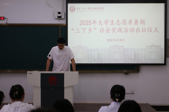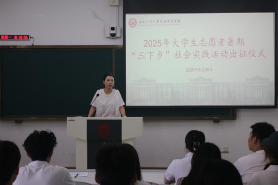 2025年大学生志愿者暑期“三下乡”社会实践出征仪式在艺术楼412教室启动。学院团委书记侯天放及志愿者代表齐聚现场。