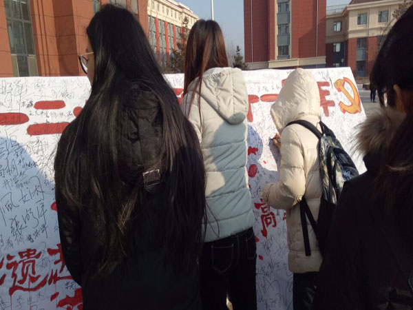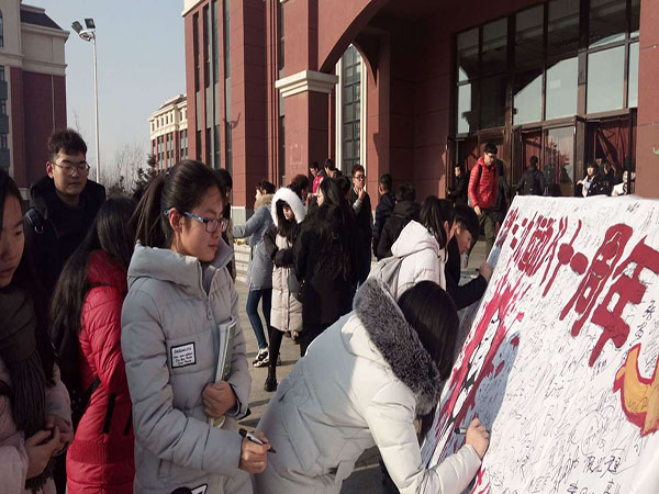 、纺织服装学院学生会干部的带领下,相关同学将书写着“秉承先辈遗志,高擎时代火炬”的宣传板放置在食堂前,成功的吸引到了来往的师生。顷刻间,展板前围满了人,过往的师生都踊跃签名,来通过此方式传达自己的一份爱国热情。活动持续了两个多小时,活动结束后,展板已经签满了密密麻麻的名字。