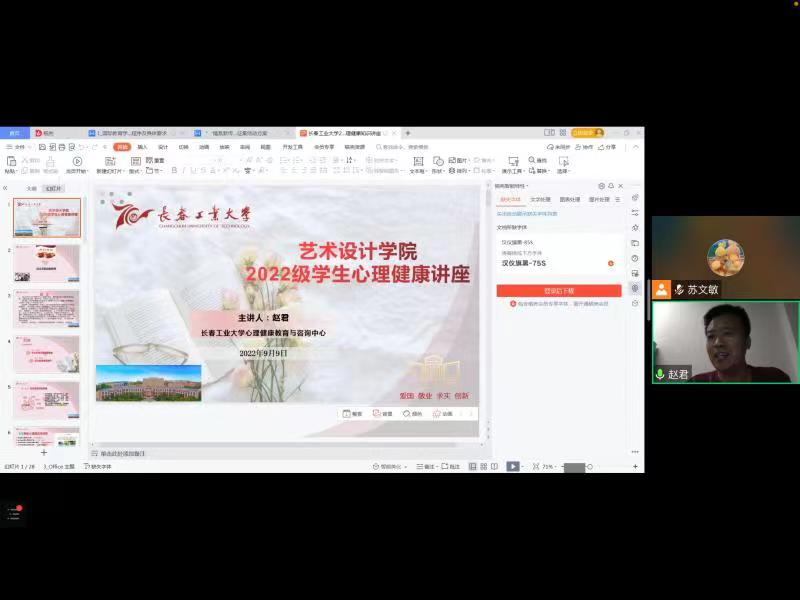 于9月9日通过腾讯会议方式开展2022级新生心理健康教育专题讲座。本次讲座由学校心理健康与咨询中心赵君老师主讲,学院全体2022级研究生和本科生参加。