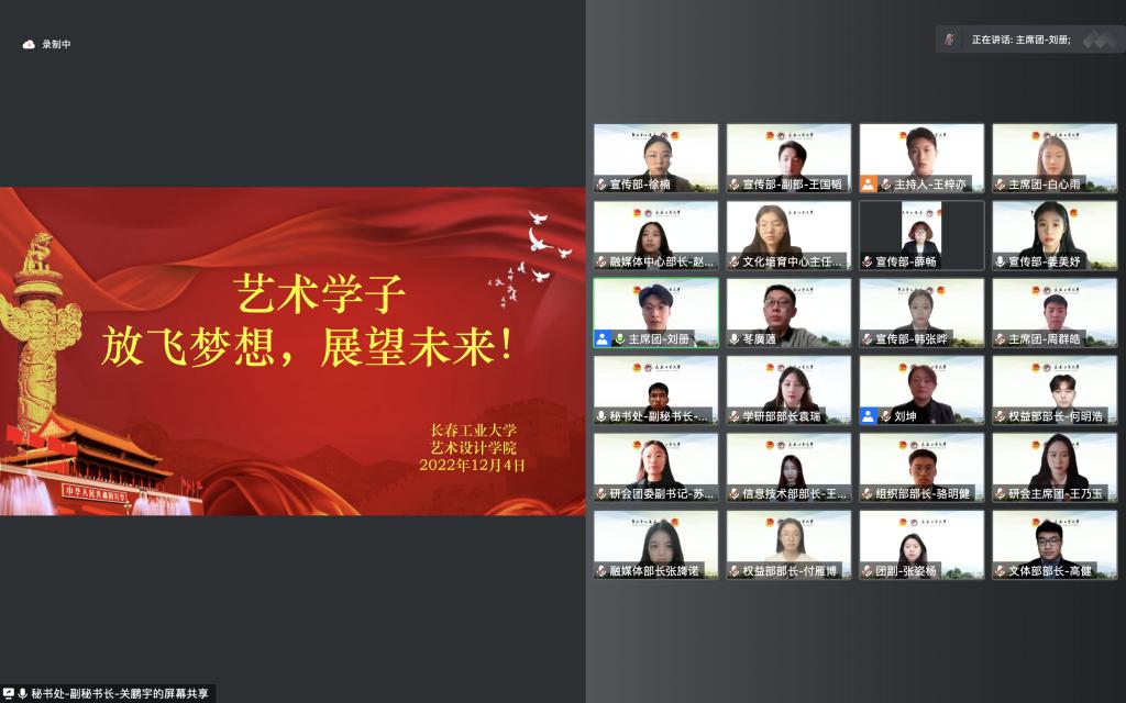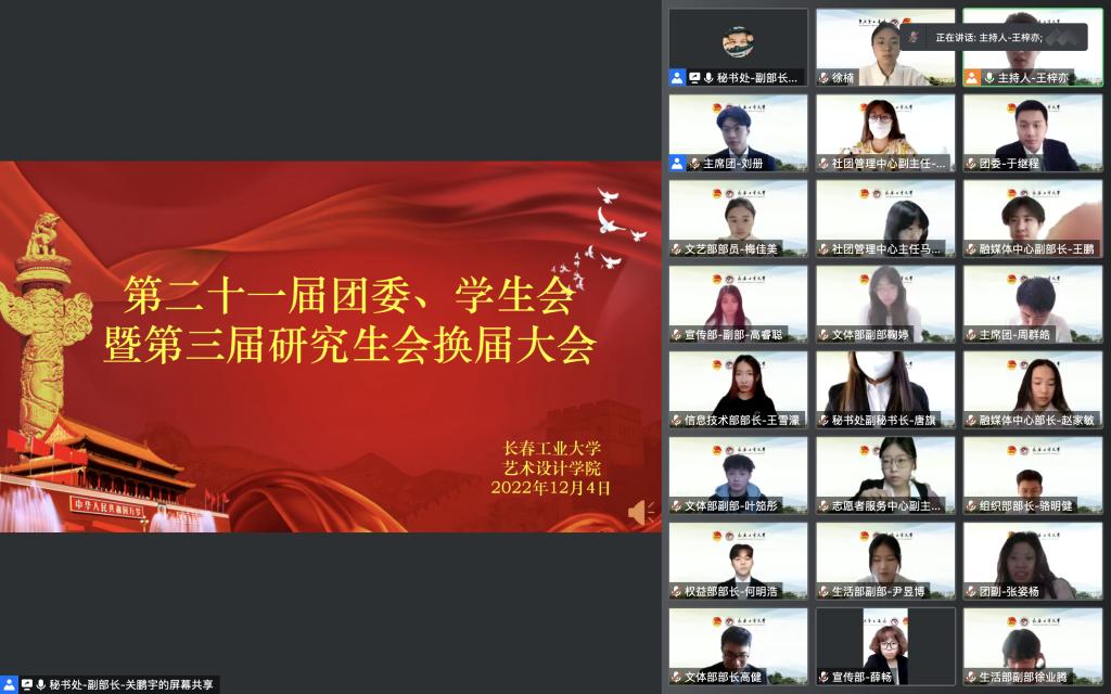 通过线上方式组织召开第二十一届团委、学生会暨第三届研究生会换届大会。学院党委副书记刘坤、专职组织员兼团委负责人董广通、学生党支部书记于丰硕、辅导员倪冲参加会议,部分兄弟学院学生会执行主席受邀出席,学院全体团学干部参加,会议由秘书部部长王梓亦主持。