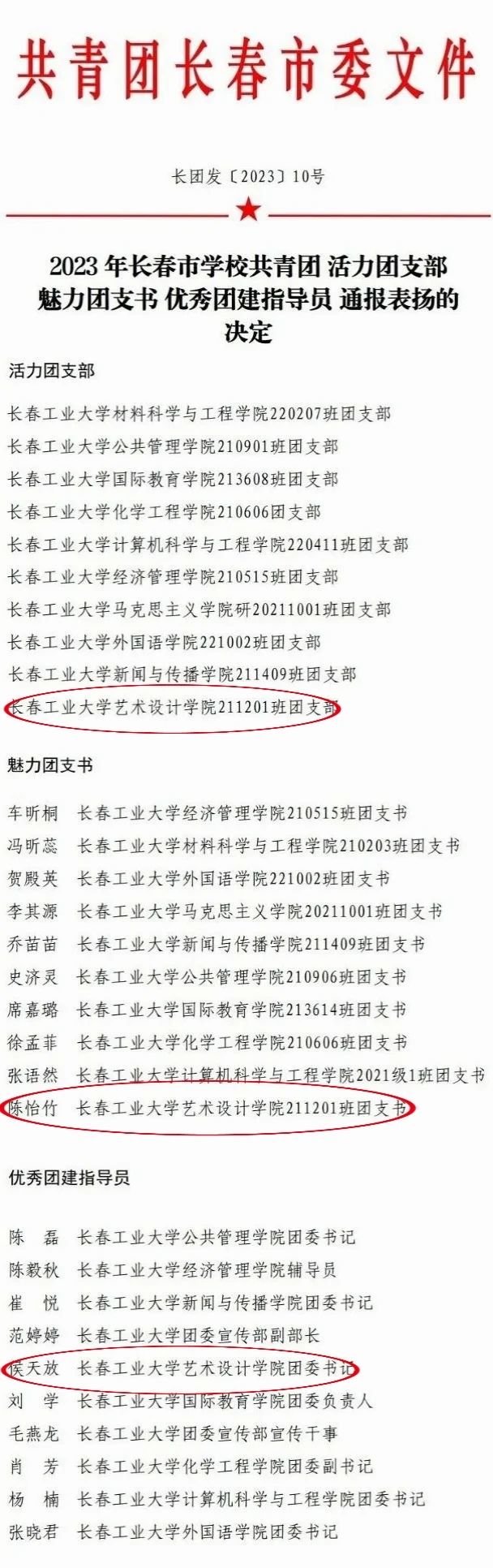 喜报:我院在2023年长春市学校共青团 “活力团支部” “魅力团支书” “优秀团建指导员”评选中取得佳绩