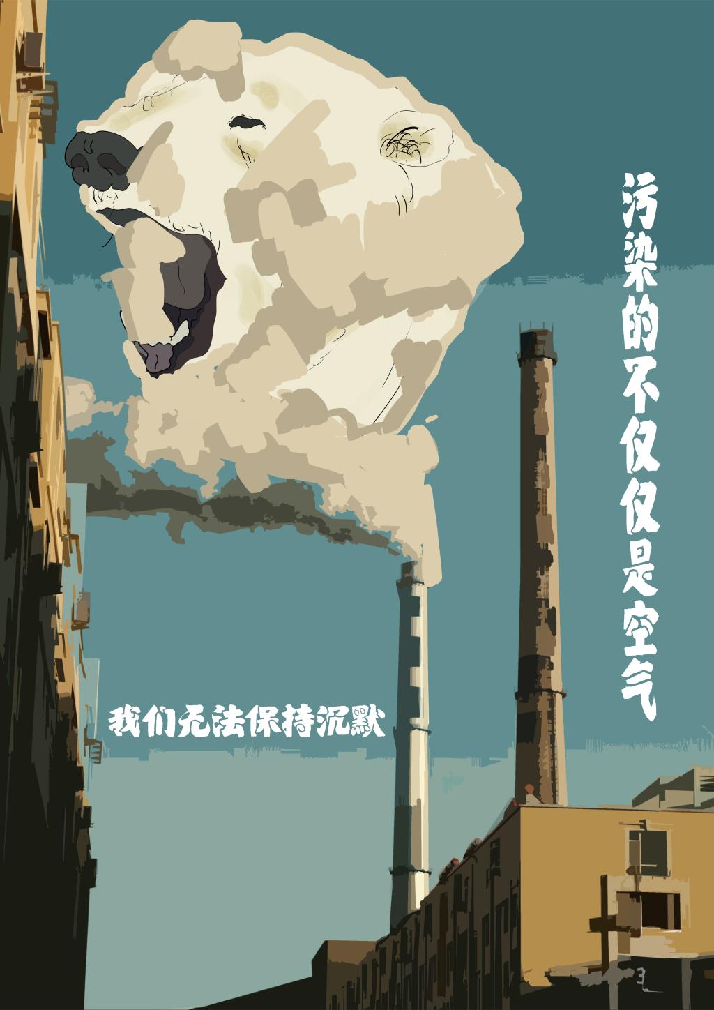 作者:张剑峰 指导教师:侯天放 作品名称:《拒绝污染》 创作感想:作品主题为工厂烟囱的排气和一只北极熊,隐喻出在大气污染中面临的环境污染、全球变暖。而北极熊只是众多生物的一个代表,他们面临着没有地方栖息的危险等问题。作品呼吁大家:节能低耗,保卫蓝天,低碳一小步,人类一大步。