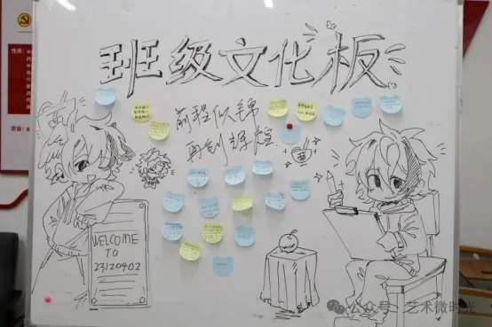 夕阳的余晖为教室镀上金色,文化板上缤纷的梦想与祝福熠熠生辉。23120402班学子眼中闪烁的光芒,正是对“匠心筑梦,艺路启航”誓言最生动的诠释。在班主任邵捷的引领下,这段满载艺术理想与青春热望的新征程,已然鸣笛出发。