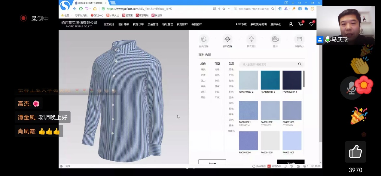 4月8日晚19:00时,第八讲《服装产业的智能化与高级服装定制》由艺术设计学院马庆瑞老师主讲。马庆瑞老师解读了高级服装定制的流程,并亲自操作在成衣定制网站怎样定制成衣。以短片视频形式演示测量身体各部位时需要注意的问题,同学们普遍反映通过马老师的讲授避免了自己上网选购成衣会出现的误区。